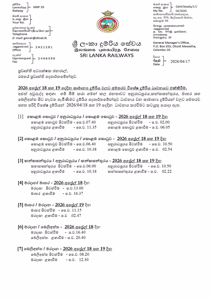 එම දෙපාර්තමේන්තුව නිවේදනය කරන්නේ, 2026 අප්රේල් 18 සහ 19 යන දිනවලදී මෙම අමතර දුම්රිය සේවාවන් ක්රියාත්මක වන බවයි.