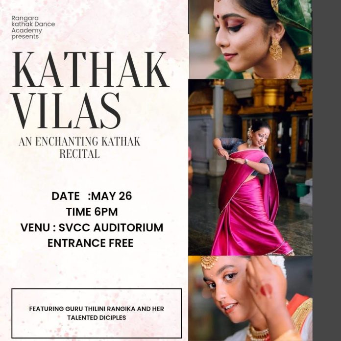 Presented by the Rangara Kathak Dance Academy, “Kathak Vilas” will occur on Monday, May 26th, at 6:00 PM at the Swami Vivekananda Cultural Centre (SVCC) auditorium in Colombo.